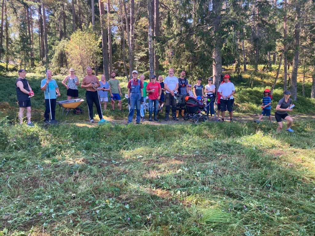 Idag var vi ett tjugotal slåttrare som i härligt sommarväder slog hela blomsterängen. Ett stort tack till alla som ställde upp och till byamännen för bra planering och genomförande. Björn och Annicas dricka, kaffe och kakor förgyllde dagen lite extra.